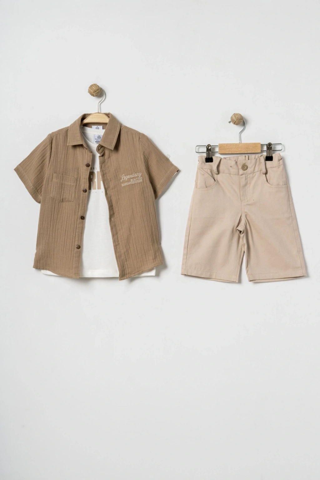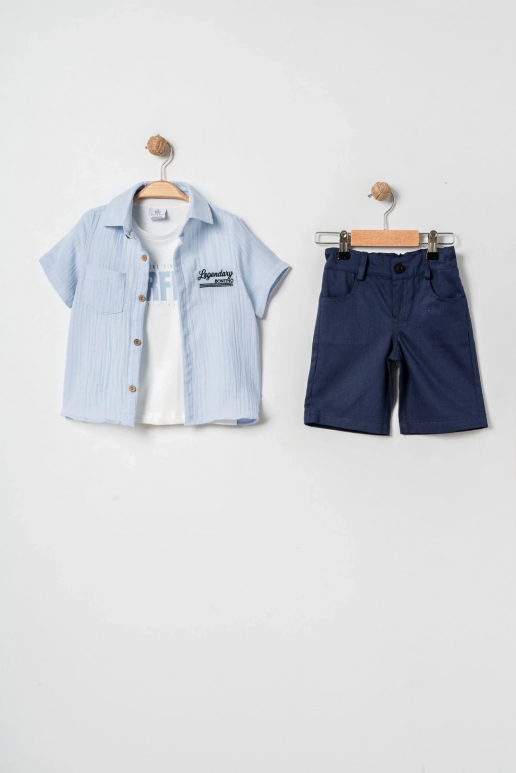 Zengin Kombin: Set içeriği; dokulu şık bir dış gömlek, baskılı bir tişört ve her ortamda şık duran lacivert gabardin şorttan oluşur.