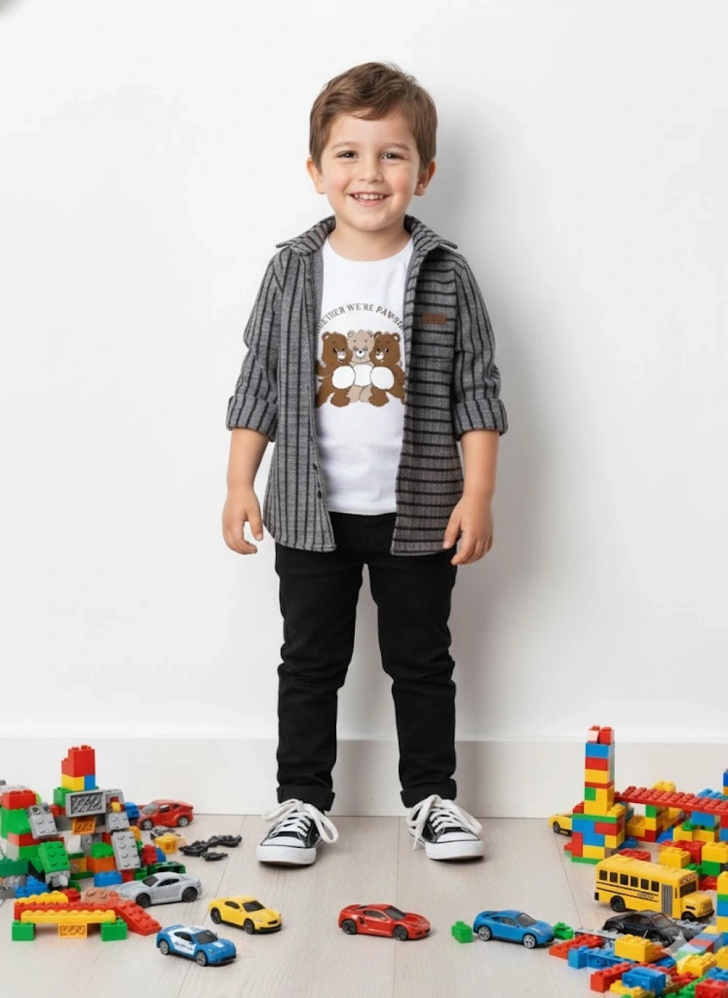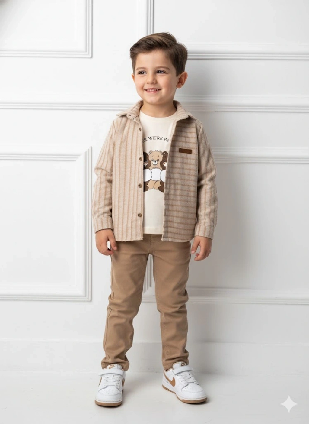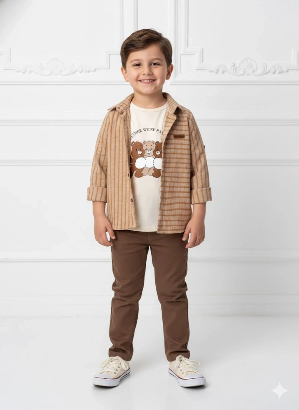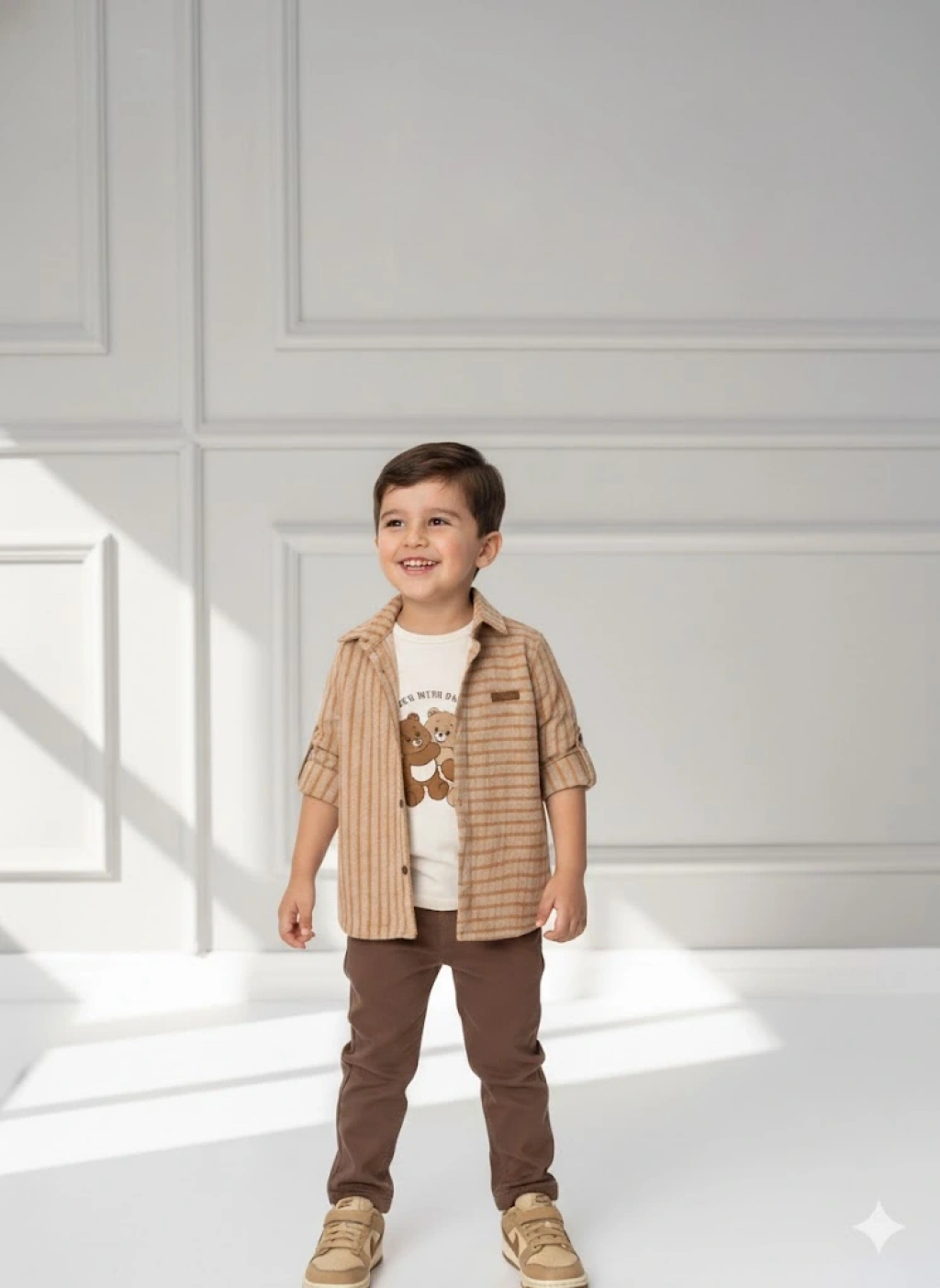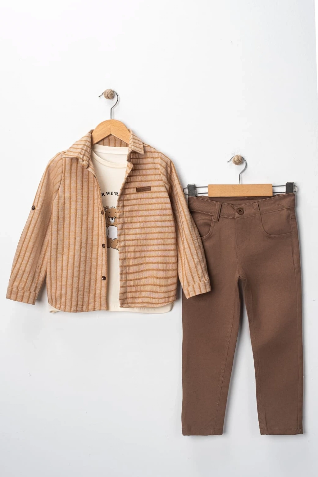 Bu üçlü takımı ayıcık baskılı tişört, düğmeli çizgili gömlek ve rahat kalıp pantolon oluşturuyor.
