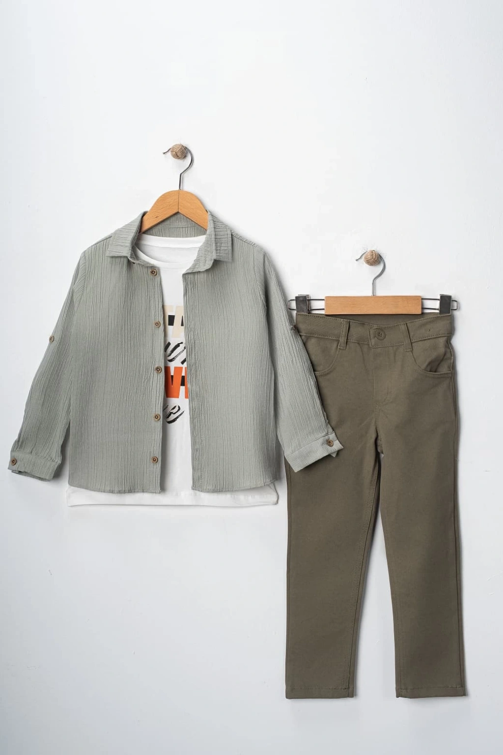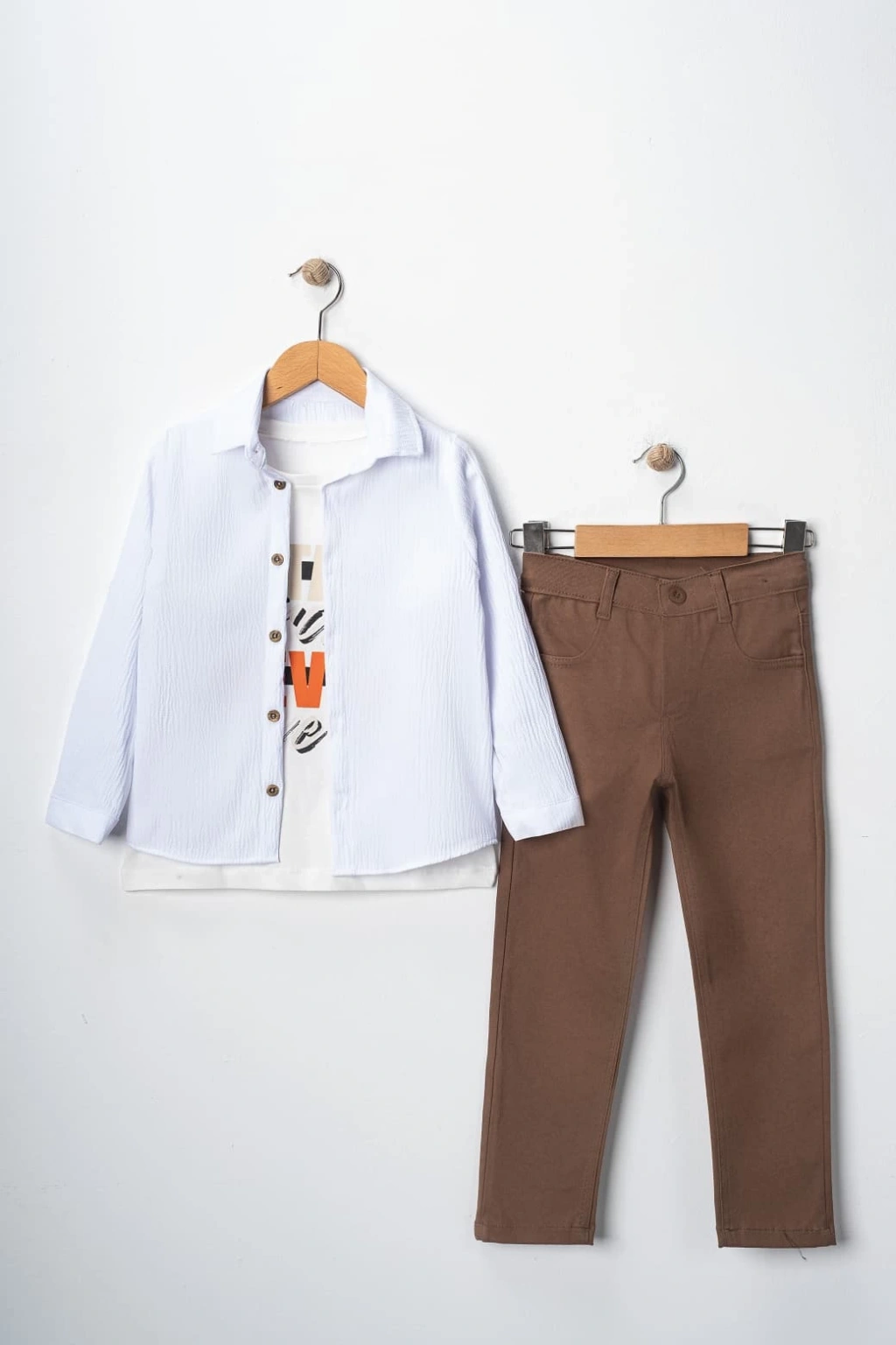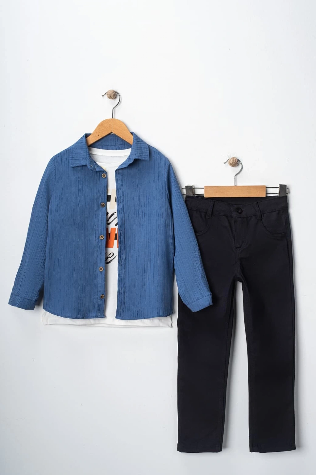 Erkek Çocuk Kolu Ayarlanabilir Gofre Gömlekli Pantolonlu Tişörtlü Üçlü Takım