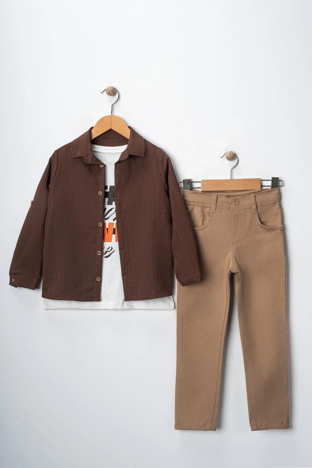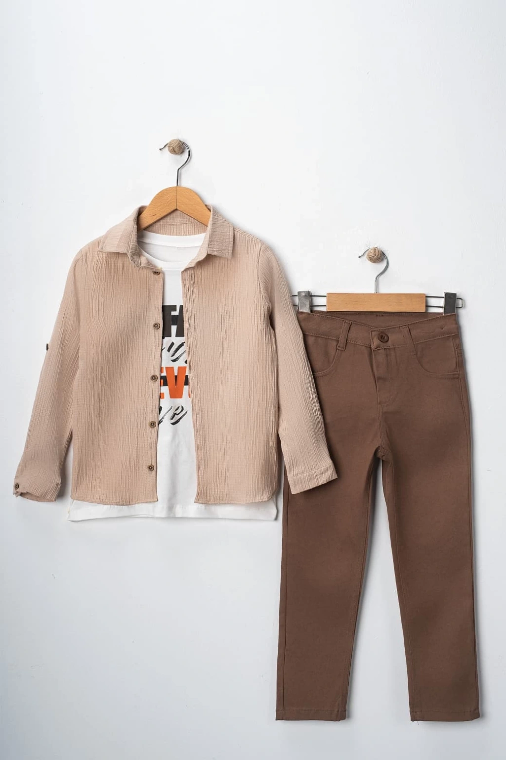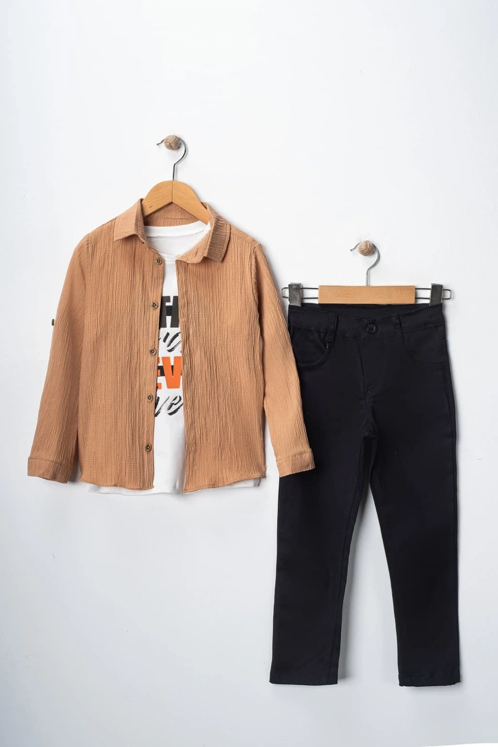 Erkek Çocuk Kolu Ayarlanabilir Gofre Gömlekli Pantolonlu Tişörtlü Üçlü Takım