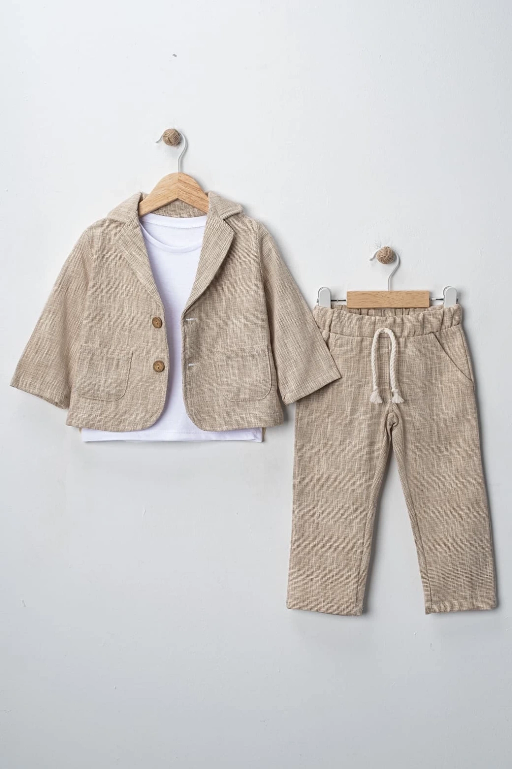 Miniklerin hem şık hem de rahat görünmesi için tasarlanan bu üç parçalı takım doğal dokusu sayesinde gün boyu konfor sunar. Nefes alabiloir 4 mevsim kullanıma uygundur.Ceket ve pantolunun kumaşı %87 Pamuk %13 Pes içeriklidir.